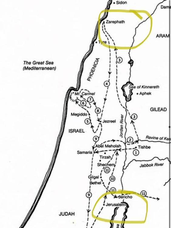 That distance in and of itself would make this journey extremely difficult. However, to add more difficulty. Zarephath is also in the heart of Baal-worshipping territory and is close to the home city of Baal-worshipping Queen Jezebel who wants Elijah killed. Zarephath was deeply dependent on the town of Sidon (the very heart of Baal territory). So Zarephath was one of the least hospitable places God could send Elijah—a city full of idolaters who want Elijah killed. Sending Elijah here makes little objective sense.